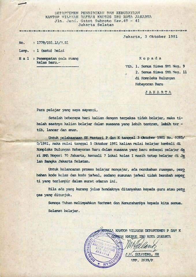 SMA Negeri 9 Jakarta dan SMA Negeri 11 Jakarta yang belajar berdampingan selama 19 tahun di “kompleks” Jl. Bulungan Blok C No.1, Jaksel, akhirnya dilebur menjadi satu pada 3 Oktober 1981, dengan nama SMA Negeri 70 Jakarta. Dikarenakan kedua sekolah ini selalu terlibat perkelahian pelajar alias “tawuran”.